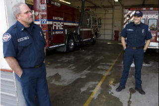 Eastside Fire & Rescue firefighters Lt. Dave Jones and Michael Tjosvold from the temporary fire station talk with reporters recently. A proposed $4.5 million bond measure on the Nov. 4 ballot would pay for some of the $8 million projected cost of a replacement station at the Transit Center. See story page 9.