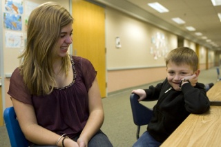 Levi Ressler, a smiling first-grader at Clark Elementary, spelled his last name slowly, glancing to his mentor after every letter to see if he was right.