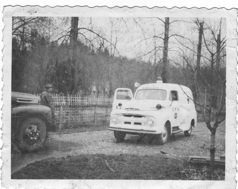 Ed Fish writes, “When the bell sounded its coded call to spot a fire’s location, all available volunteers and the inevitable horde of youngsters came on the run to Alben Ek’s ice cream parlor, (where the overalls were hung just inside the door), and if the customers stayed out of the way the volunteers could get changed and have the hose wagon rolling in short order… everybody would grab hold and run like heck!”