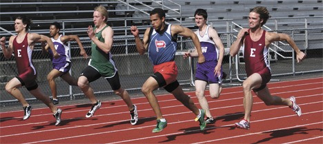 Eastlake's Daniel Jackstadt (far left) leads a pack of runners in the 100. He finished first in the event in 11.09 seconds