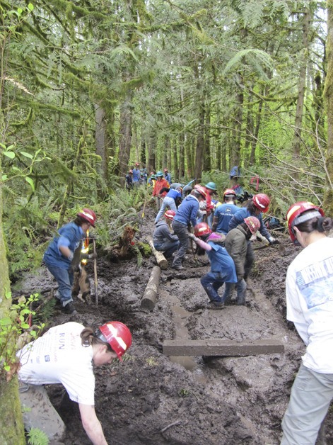 Volunteers included grandmothers, mother and daughter pairs, REI employees and a group from Women Climbers Northwest. These spirited women braved the mud to improve the popular Tiger Mountain Trail by building a raised trail surface and improving the trail tread.