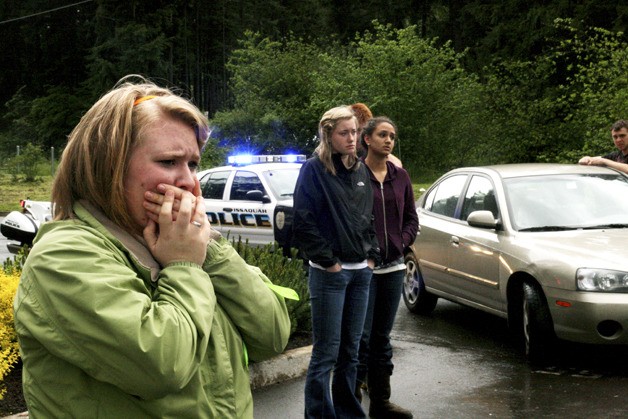 Issaquah High School students Teagan Cameron, Abby Glasgow and Sarah Morsi look with shock and horror at the scene of a horrible car crash… fortunately, it was just a staged scenario.