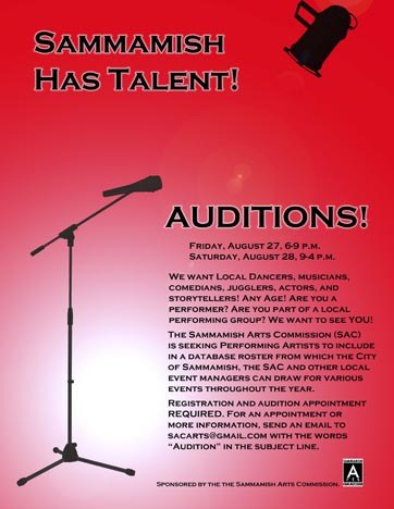 The Sammamish Arts Commission is holding auditions for local artists this Friday and Saturday, Aug. 27 and 28, at Sammamish Commons in City Hall. The commission is looking for artists who specialize in the performing arts, such as theater, dance, music and the spoken word. Artists who are selected will be added to the art commission’s roster of performers for the coming year.