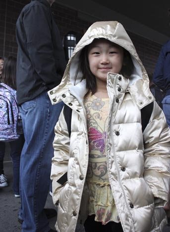 First-grader Mina Lee’s smile peeked out from beneath the hood of her platinum parka, as her little sister looked around bewildered and clung to mommy’s hand. Mina’s brother, also starting school on Tuesday, had already disappeared into the throng of students.