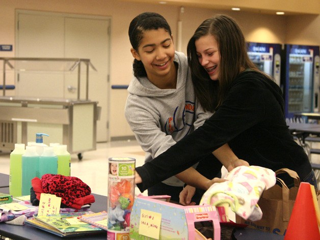 Ally Kruper, left, and Katherine Adams sort through gifts students donated to the Issaquah Food Bank Christmas Basket drive.