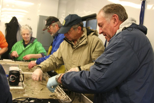 Nick Samargis snips the andipose fins off of Coho Salmon at the Issaquah Salmon Hatchery. While spawning returns were poor this year, the hatchery plans to release 500,000 Coho in the spring.