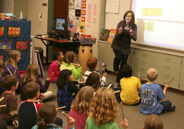Leah Sweeney plays the xylophone along with her music class at Grand Ridge elementary school. Her teacher, Alice Badgley, was one of 31 teachers in the Issaquah School District to receive National Board Certification.