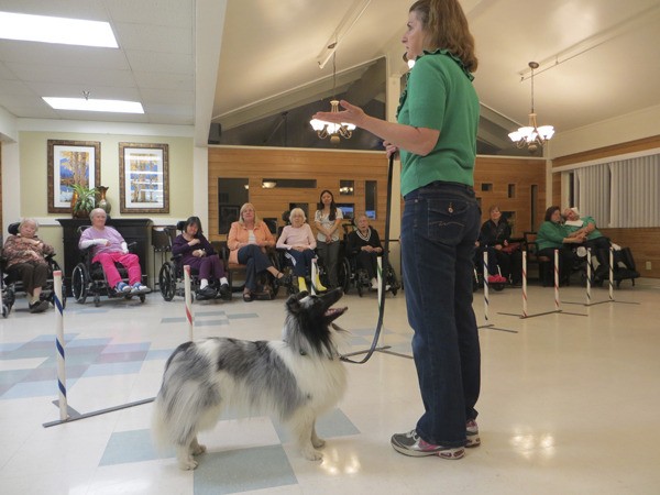 At Issaquah Nursing and Rehab, Carlisle had space to set up a short agility course consisting of 12 poles that Truitt runs through, like a slalom run. In competition he has to maneuver through 24. With speed and grace he nailed it, much to the resident’s glee. The reward — cheese at the finish.