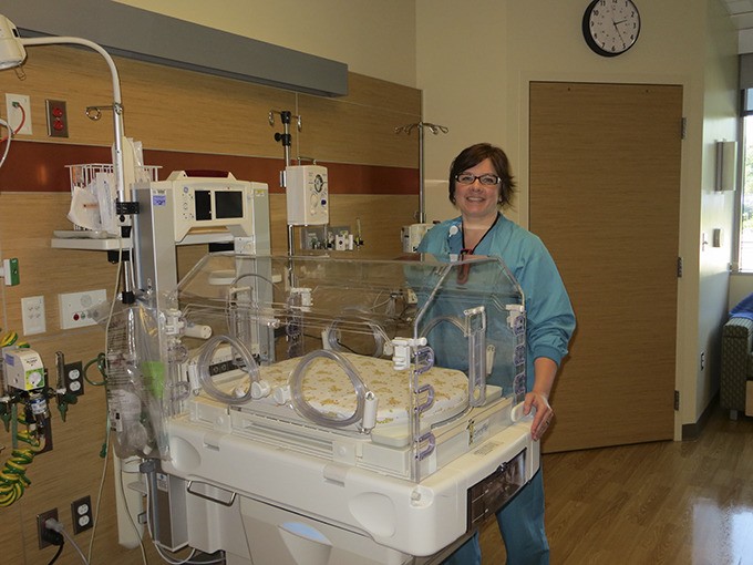 Wendy Colgan, nurse manager for obstetrics and pediatrics, stands by a radiant warmer for more at-risk preemies.