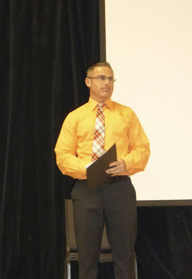 When Zmuda finally took the stage, the room erupted in applause. He outlined his career and said he comes from five generations of teachers.