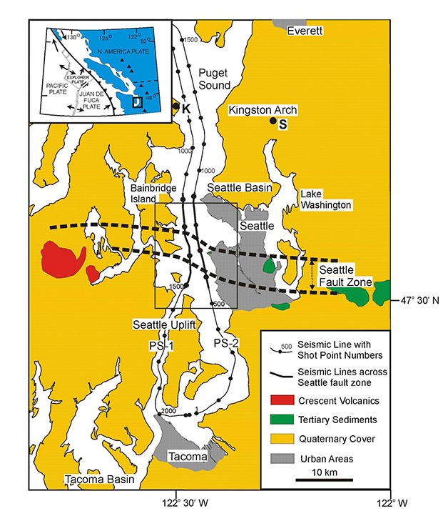 A seismic map of the Puget Sound region. The Seattle Fault Zone runs parallel to Issaquah's stretch of Interstate highway 90.