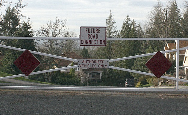 The barricade was installed before the city was incorporated, per a conditional agreement between King County and three residential plats, the Chrysalis Estates, Webers Ridge and Old Mill Point. The barricade blocks a direct route, cutting through Timberline and Hidden Ridge neighborhoods, from Sahalee Way to SR 202.