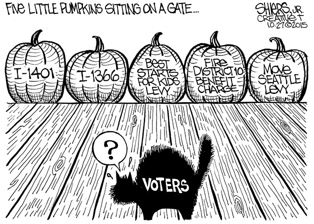 This week’s editorial cartoon by Frank Shiers deals with voter confusion over the various initiatives and levies on the general election ballot.