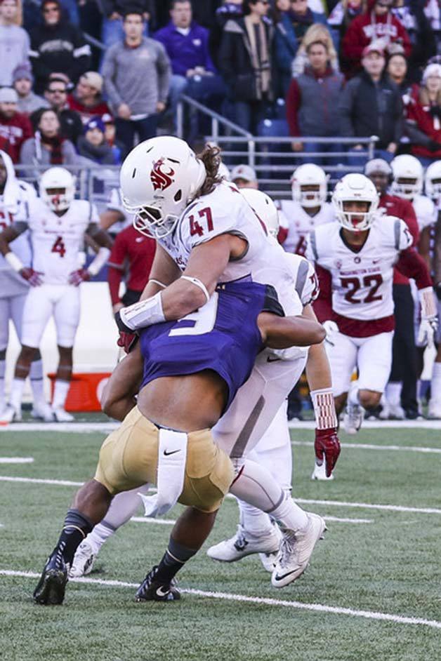 Washington State Cougars redshirt sophomore linebacker Peyton Pelluer, right, tackles Washington Huskies running back Myles Gaskin in the 2015 Apple Cup at Husky Stadium in Seattle. The Cougars completed a memorable 2015 season with a 20-14 win against the Miami Hurricanes in the 2015 Sun Bowl on Dec. 26 in El Paso, Texas. Washington State finished with an overall record of 9-5. Pelluer, a 2013 Skyline graduate, finished the Sun Bowl with three tackles and an interception.