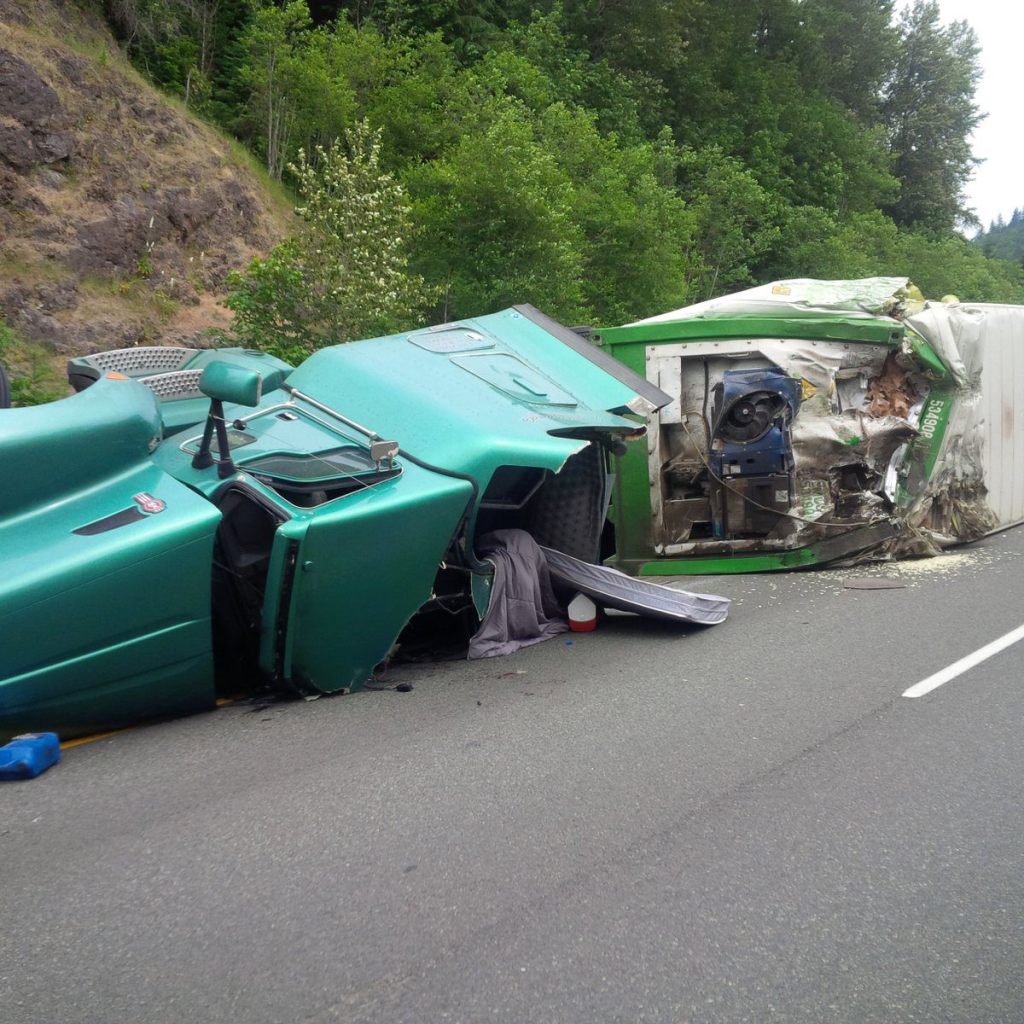 The semitrailer had been traveling westbound on Route 18 when it managed to move into the eastbound lane, striking both a dump truck and a car. The car was barely damaged, but the dump truck “got hung up on the guardrail,” Washington State Patrol Trooper Chris Webb said.