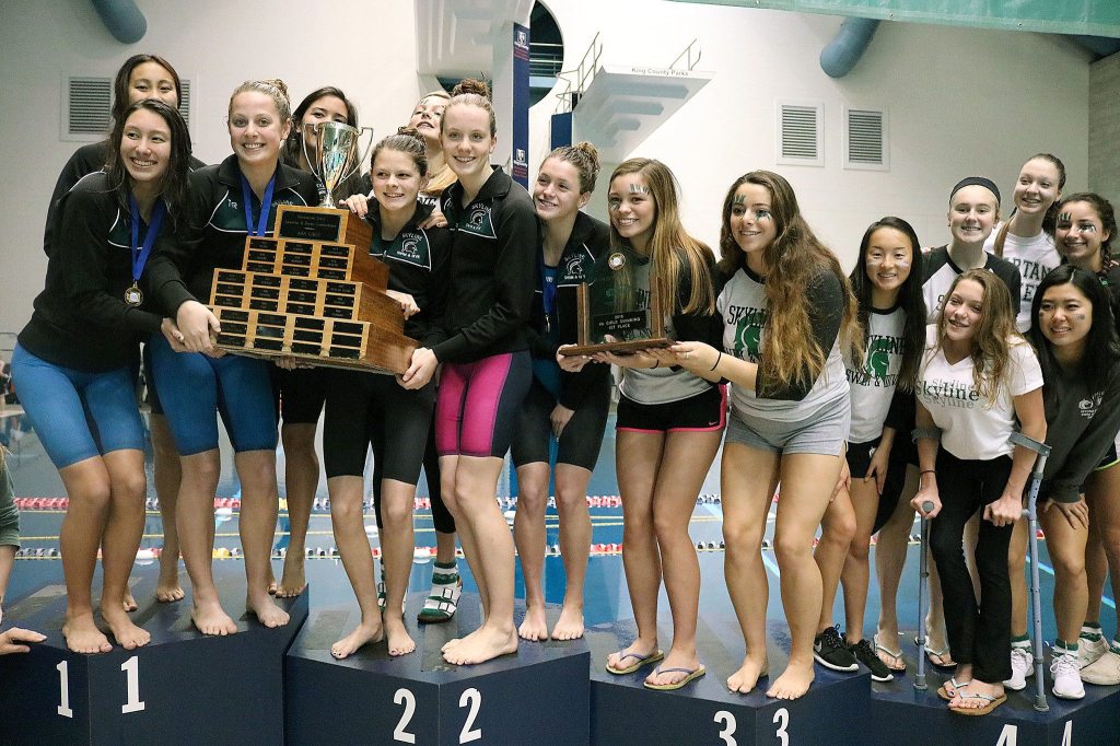 The Skyline girls swim and dive team took home its second straight 4A state championship Saturday at King County Aquatic Center in Federal Way. Joe Livarchik/staff photo.