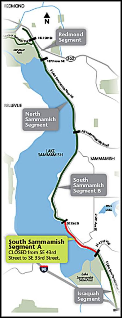 King County work crews are closing the East Lake Sammamish Trail from Southeast 43 Way to Southeast 33 Street beginning Dec. 19 to pave and widen the South Sammamish Segment A portion of the trail.