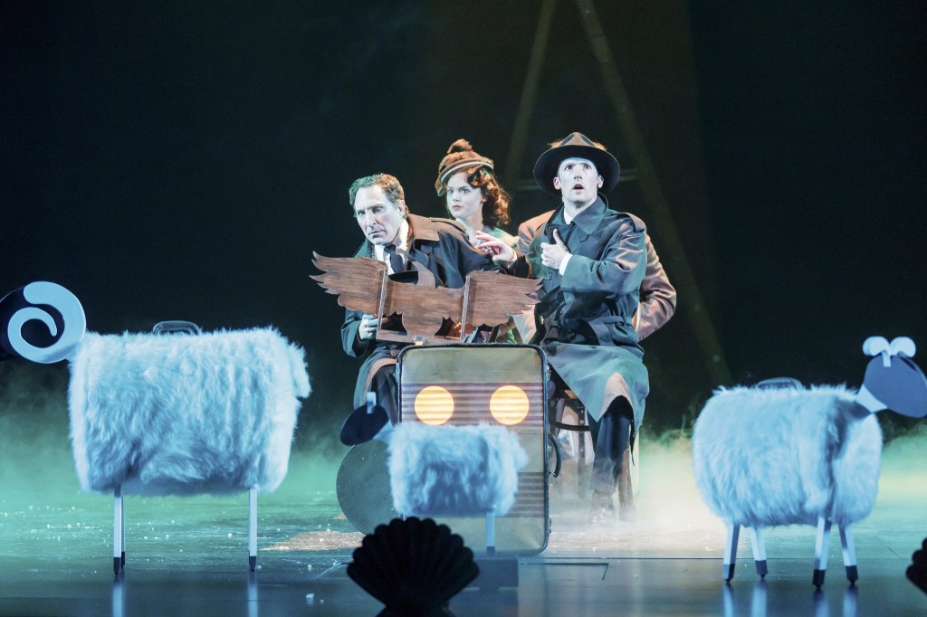 Props provide many of the show’s gags, such as a light bulb that comes on whenever Hannay has an idea. A relatively small collection of props makes do for every scene, as long as audience members are able to use their imaginations. A set of suitcases becomes train seats in one scene and in another scene — with the addition of two stools and a podium — becomes an old-fashioned automobile.