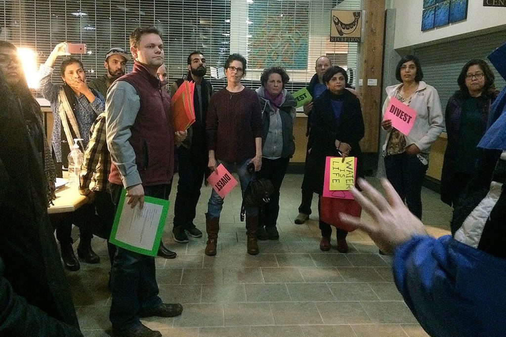 Roughly 30 protesters were in attendance, with nine addressing the council over the course of a half hour. While individual protesters spoke, those in the audience held up signs that read “Divest,” “Water is life” and “No DAPL.”