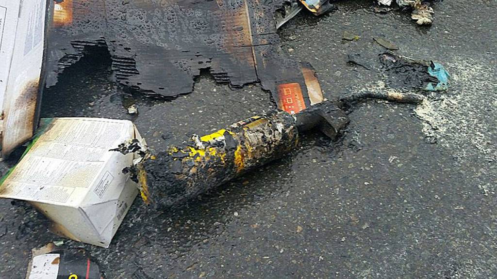 Recycling materials were dumped in the roadway after a recycling truck driver noticed a fire had broken out in the back of his truck. Police believe the fire was caused by a butane torch that had been placed in a recycling bin (photos courtesy of the Sammamish Police Department’s Facebook page).