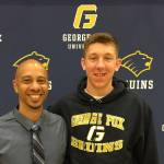Issaquah Eagles boys basketball player Brent Wilson (right) committed to the George Fox University men’s basketball program on April 24. Wilson, who plays in the post, led the KingCo 4A Conference in blocked shots per game during the 2016-17 season. George Fox University is coached by Maco Hamilton (left).