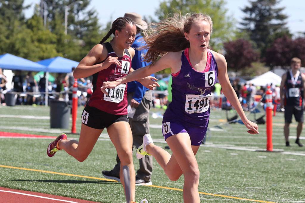 Eastlake Wolves junior Brooke Manson, left, captured second place in the Class 4A state track meet 800-meter run with a time of 2:11.51 on May 27 at Mount Tahoma High School in Tacoma. Lake Stevens sophomore Taylor Roe nabbed first place with a time of 2:11.09.
