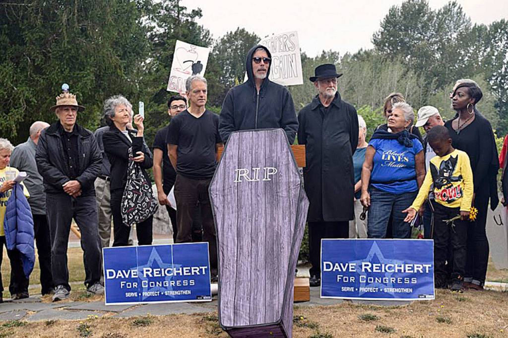 “Fill up the cemetery, fill up the grave, all you have to do is vote for Dave!” chanted the black-clad mourners as they carried a coffin up Southeast 56th Street to Reichert’s Issaquah office.