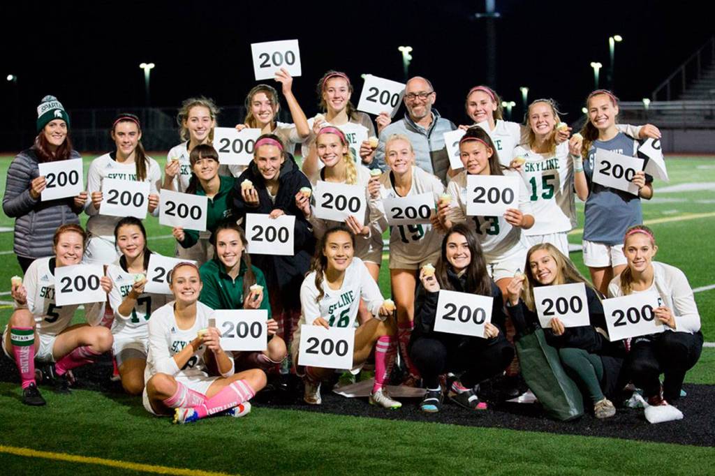 Photo courtesy of Dave Mitchell                                Skyline Spartans girls soccer head coach Don Braman attained a coveted milestone on the soccer field courtesy of his team’s 3-0 victory against the Newport Knights on Oct. 5 in Sammamish. The triumph was Braman’s 200th career win as head coach of the Spartans girls soccer program. Skyline players Daniella Roni (17th minute), Clare Wate (37th minute) and Saskia Slater (71st minute) each scored a goal apiece in the win against Newport. Spartans’ players Alison Kremer, Julia Mitchell and Maddie Butz each had an assist in the game as well. Skyline currently has an overall record of 9-1.