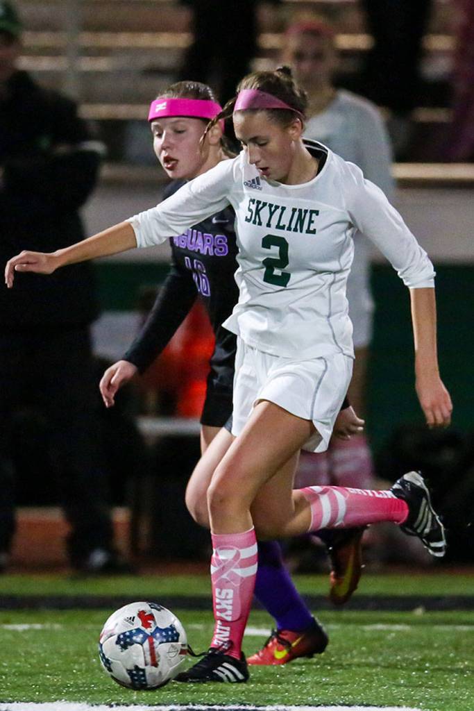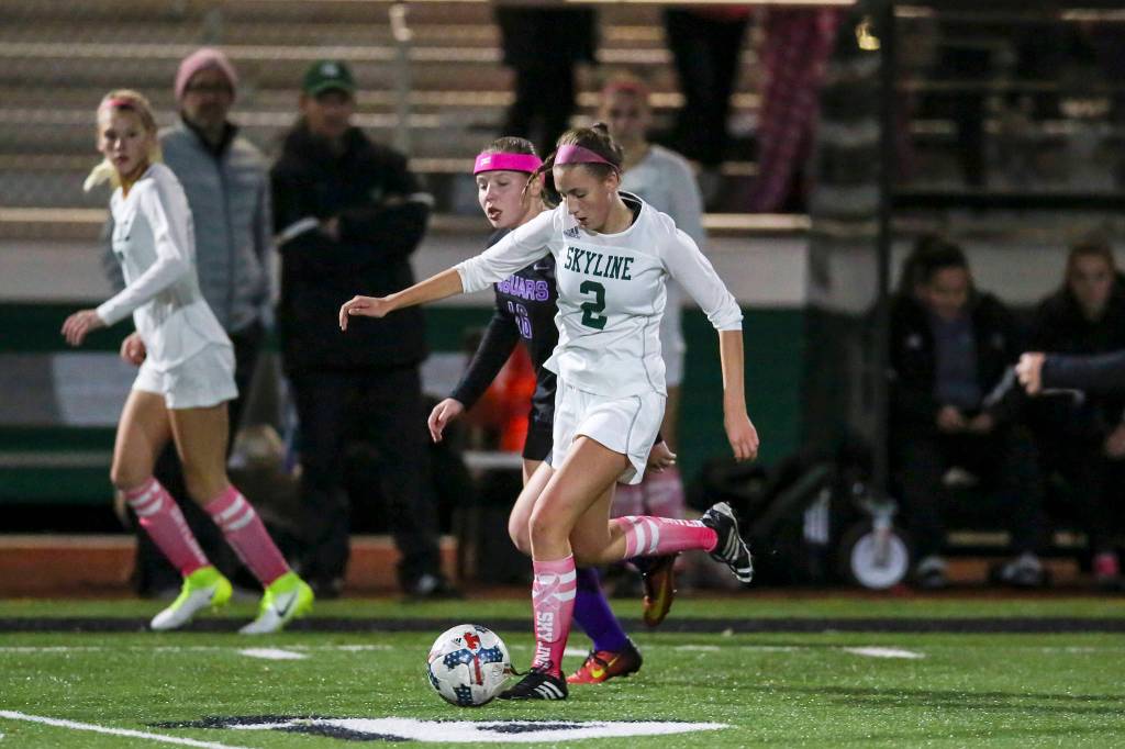 The Skyline Spartans cruised to a 3-0 win against North Creek on Oct. 17. Skyline improved their overall record to 11-2 with the victory. Skyline midfielder Bella Calvert-Lee (pictured) dribbles the ball up the field against North Creek.