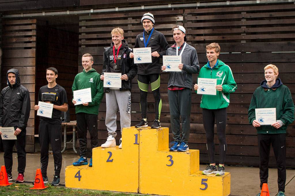 Local runners turned in memorable performances at the Class 4A KingCo League meet on Oct. 21 at Lake Sammamish State Park in Issaquah. Eastlake senior Nate Pendleton finished in first place with a time of 15:41.23. Issaquah senior Luke George captured second place with a time of 15:52.29. Skyline’s Griffin Ganz earned fourth place with a time of 16:00.10 and Issaquah junior Sam Griffith nabbed seventh place (16:10.64). The Issaquah Eagles boys Cross Country team captured first place at the meet, compiling 57 total team points (low score wins in Cross Country). Skyline finished in third place with 88 total points.