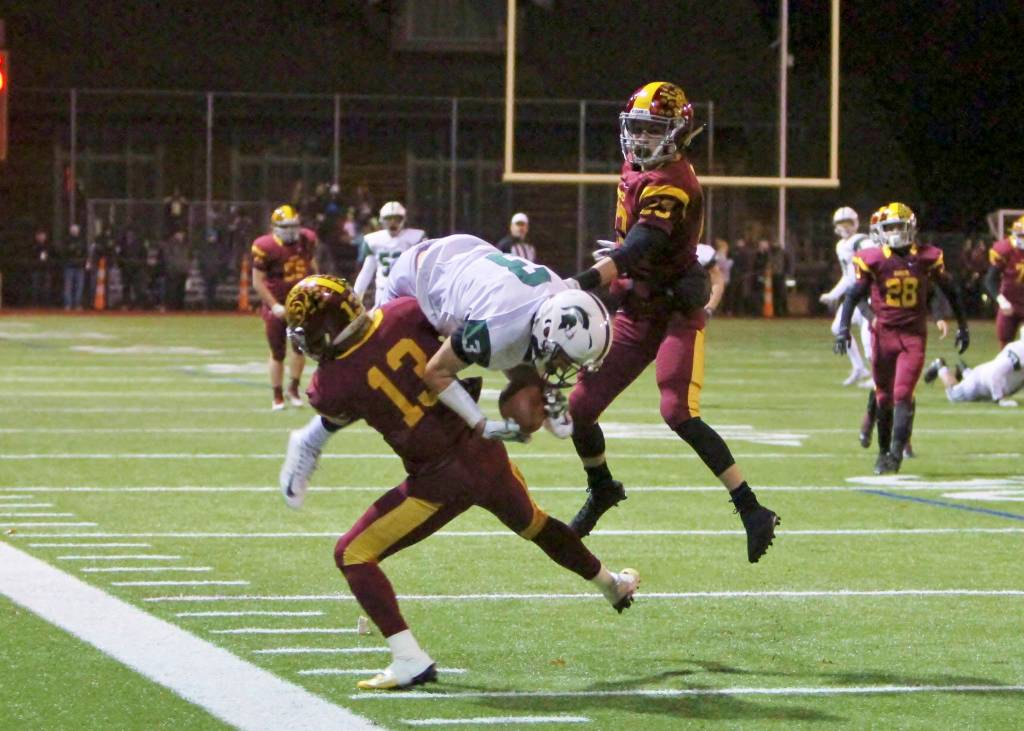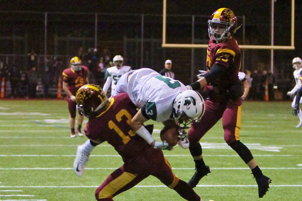 The Skyline Spartans defeated the Enumclaw Hornets 42-7 in a winner-to-state, loser-out playoff game on Nov. 3. Skyline will face the Bothell Cougars in first round of the Class 4A state playoffs on Nov. 10 or Nov. 11. Skyline wide receiver Luke Stiles (pictured) got hit hard by an Enumclaw defensive back after hauling in a pass down the sideline.