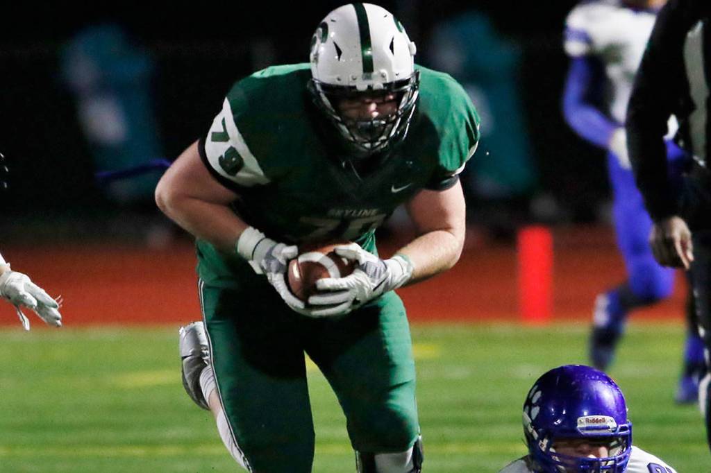 The Skyline Spartans defeated the Bothell Cougars 31-28 in the first round of the Class 4A state playoffs at Skyline High School in Sammamish on Nov. 10. Skyline defensive lineman Matthew Cindric (pictured) returns a fumble for a touchdown in the second quarter. Cindric finished the game with a team-high three sacks. Skyline will face Central Valley in the Class 4A quarterfinals on Nov. 17 or Nov. 18.