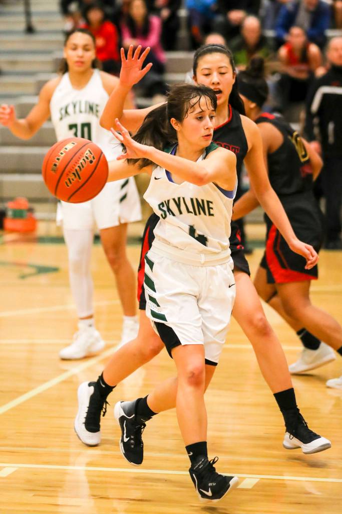 The Newport Knights girls basketball team earned a 68-58 win against the Skyline Spartans on Dec. 15 at Skyline High School in Sammamish. Skyline dropped to 4-2 overall with the loss. Skyline senior guard Annie Taylor (pictured) dribbled the ball toward the basket against Newport.