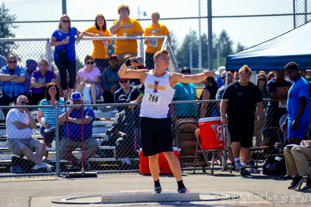 Issaquah Eagles senior Joey Jensen earned first place with a toss of 57 feet, 8.25 inches in the shot put at the Class 4A state track meet on May 24 at Mount Tahoma High School in Tacoma.