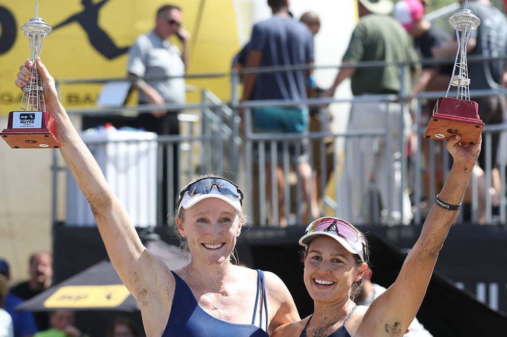 The doubles team of Emily Day (Torrance, California) and Betsi Flint (Phoenix, Arizona) earned a comeback 2-1 (19-21, 21-19, 18-16) victory against April Ross/Caitlin Ledoux in the women’s AVP Seattle Beach Open championship match on June 25 at Lake Sammamish State Park in Issaquah.