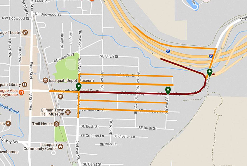 The City of Issaquah is closing East Sunset Way from Second Avenue SE to I-90 Exit 18 off-ramps starting 7 a.m. Aug. 13 for a continuous 36 hours, including overnight.