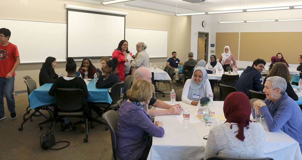 People gathered around several tables set up throughout the room and asked a variety of questions they wanted to know about the Muslim faith and community. Interlake High School junior Mina Zavary was one of the facilitators and answered questions regarding the role of women in the Muslim culture, wearing the hijab, and how her community was affected by the travel ban executive order in 2017.