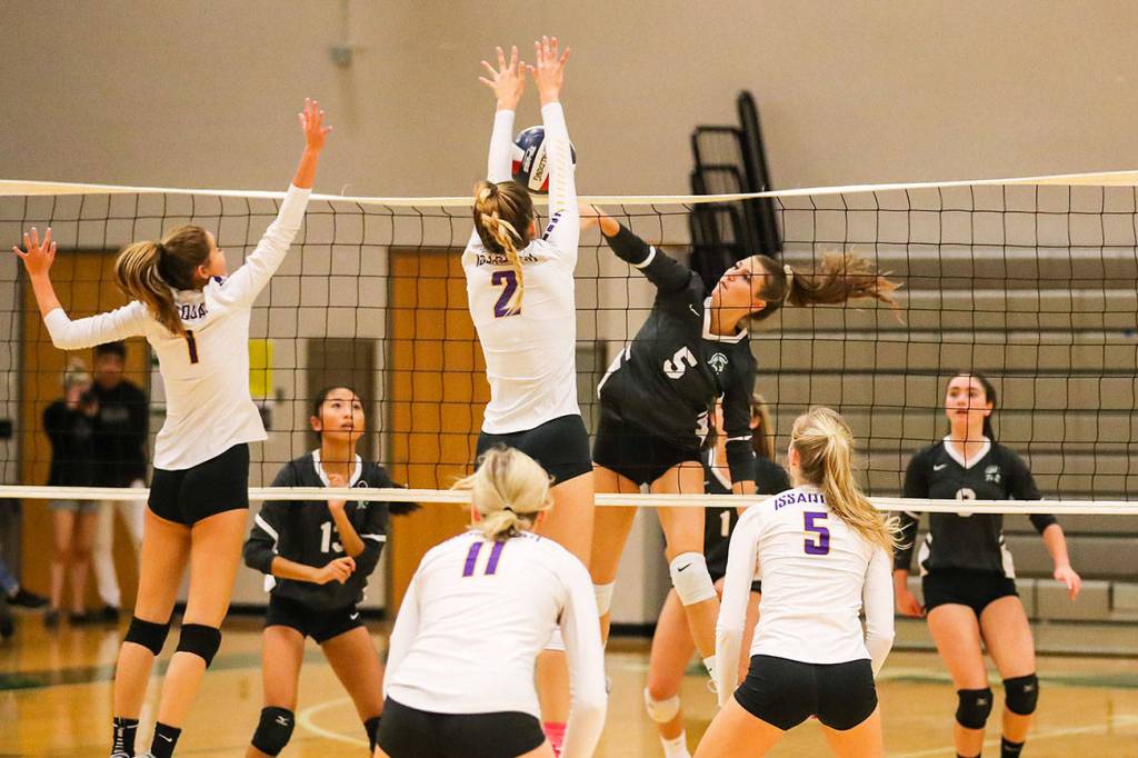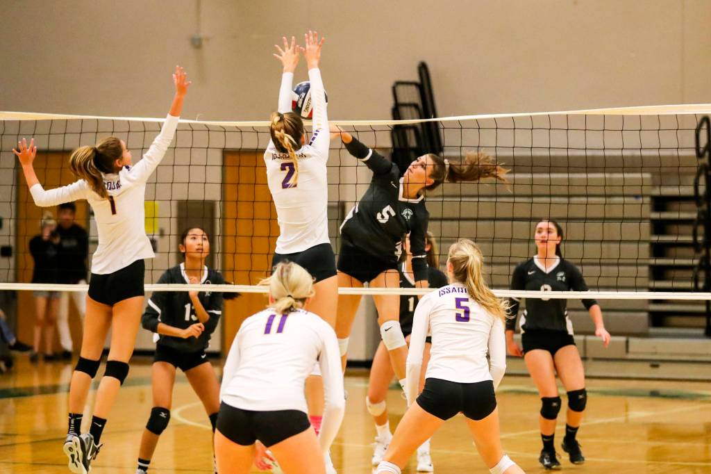 The Issaquah Eagles cruised to a 3-0 victory against the Skyline Spartans in a rivalry matchup on the volleyball court on Oct. 3 in Sammamish. Issaquah junior Maya Patton, (No. 2), leaps into the air for the block at the net against Skyline. The Eagles improved their overall record to 7-1 with the victory.