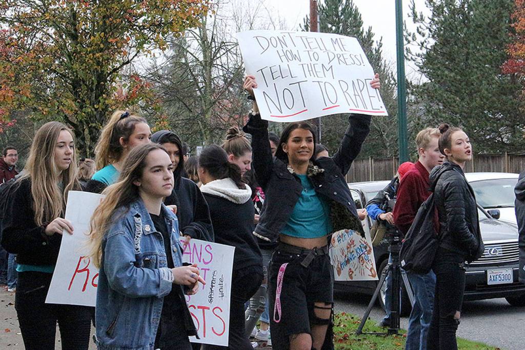 More than 100 students lined 228th Avenue with large signs saying, “Don’t tell me how to dress! Tell them not to rape,” “ISD…How would you like to be kept in class with your rapist?” “Time’s up,” and “Horrible day to be a Spartan.”