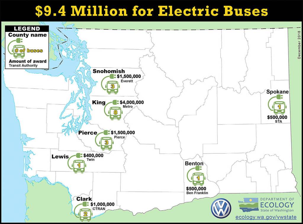 The department— which oversees the settlement funds — awarded $9.4 million Snohomish, King, Pierce, Lewis, Benton, Spokane and Clark counties to purchase 19 electric transit buses.
