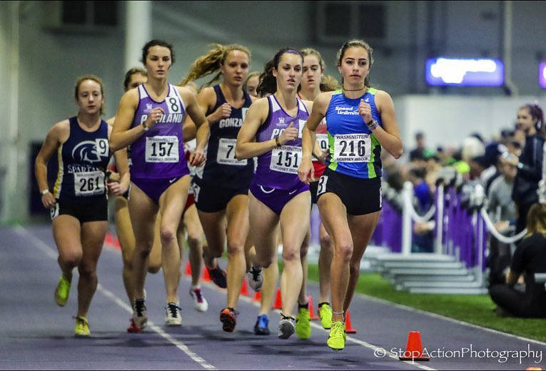 Issaquah Eagles sophomore Julia David-Smith (pictured furthest on the right) clocked a time of 5:04. 16 in the one-mile run at the University of Washington indoor track meet on Jan. 12 in Seattle. David-Smith earned first place in the Section 4 heat of the race. David-Smith finished ahead of collegiate athletes from the University of Portland, Gonzaga University, Seattle Pacific University, Western Oregon University, Simon Fraser University and Trinity Western in the race.