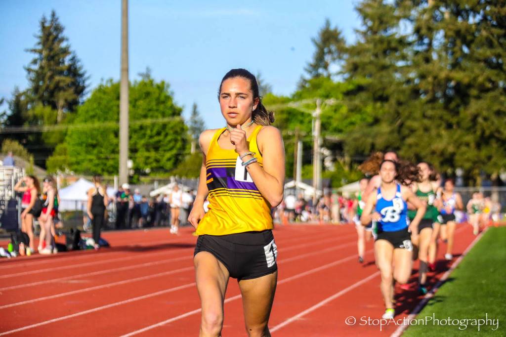 Issaquah Eagles sophomore Julia David-Smith captured first place at the 2019 KingCo Championships in the 4A girls 3,200 with a time of 10:59.05 on May 8 at Lake Washington High School in Kirkland. David-Smith also earned a first-place finish in the 1,600 with a time of 5:00.37.