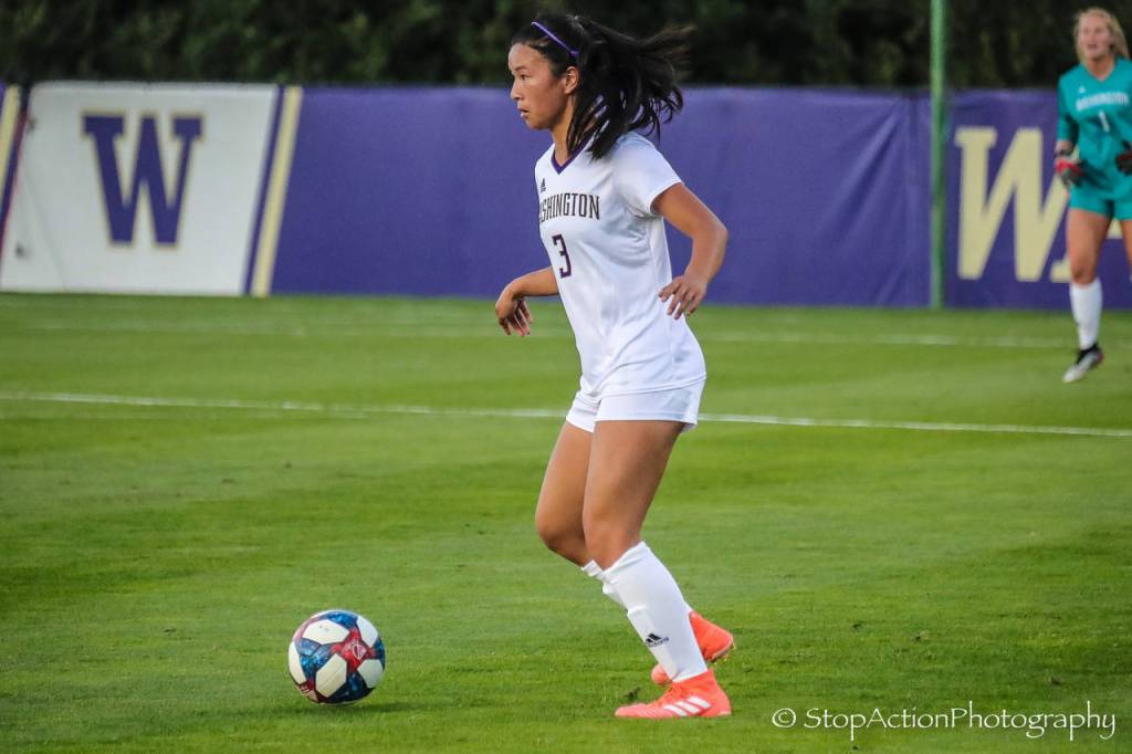 Issaquah High alumnus Kaylene Pang (pictured) plays defender for the University of Washington soccer squad during its Aug. 26 home match against Seattle University. Karlee Steuckle, formerly of the ISC Gunners, played forward during the match. After two overtimes, the final score was 0-0. Photo courtesy of Don Borin/ Stop Action Photography