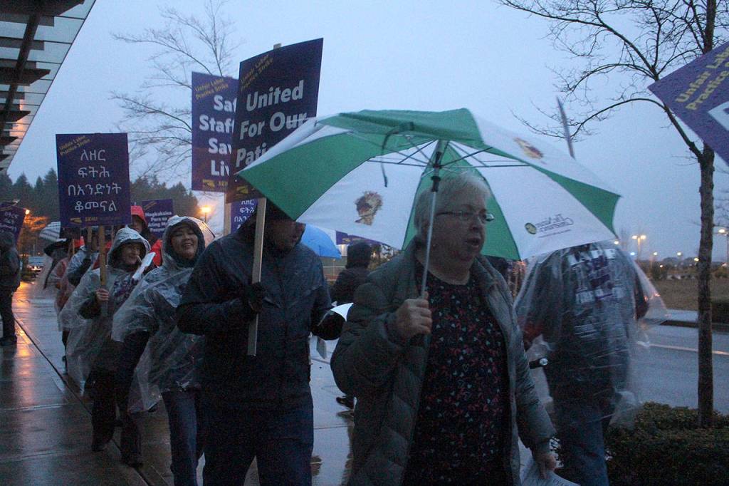 Donned with umbrellas, clear plastic rain ponchos and oversized purple and white signs, dozens of striking nurses and staff walked out of Issaquah’s Swedish Hospital campus at 7 a.m. Tuesday morning (Jan. 28) beginning a three-day strike.