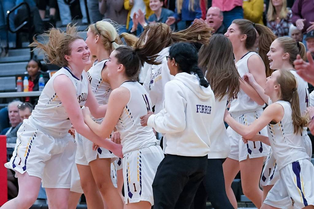 The Issaquah girls basketball team celebrates its 67-50 win over Kentwood in a loser-out regional playoff game on Feb. 29 at Sammamish High School. The win secured the Eagles a spot in the 4A state tournament. Photo courtesy of Patrick Krohn/Patrick Krohn Photography