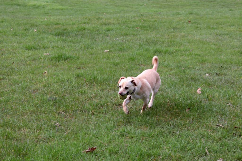 The pooch was clearly enjoying playing fetch with Buck throwing her tennis ball. They had her leash handy, but let her off for the game.
