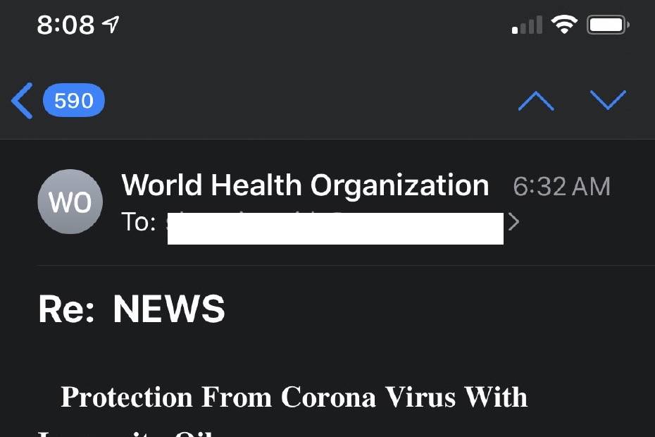 “If you get a text or email promising cures, cash or COVID-19 Image of scam email received by Washingtonianprotection if you’ll just click on a link, be wary,” Ferguson said. “Scammers are likely trying to steal your personal information or install harmful software on your device. Scammers take advantage of fear and uncertainty to make you go against your better judgment and click on a link or share personal details. Remember: If something seems too good to be true, it probably is.”