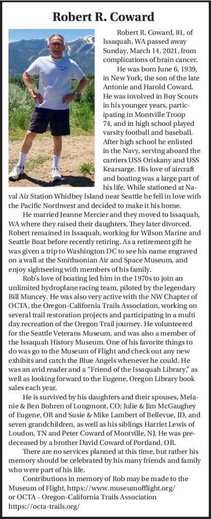 Rob’s love of boating led him in the 1970s to join an unlimited hydroplane racing team, piloted by the legendary Bill Muncey. He was also very active with the NW Chapter of OCTA, the Oregon-California Trails Association, working on several trail restoration projects and participating in a multi day recreation of the Oregon Trail journey. He volunteered for the Seattle Veterans Museum, and was also a member of the Issaquah History Museum. One of his favorite things to do was go to the Museum of Flight and check out any new exhibits and catch the Blue Angels whenever he could. He was an avid reader and a “Friend of the Issaquah Library,” as well as looking forward to the Eugene, Oregon Library book sales each year.