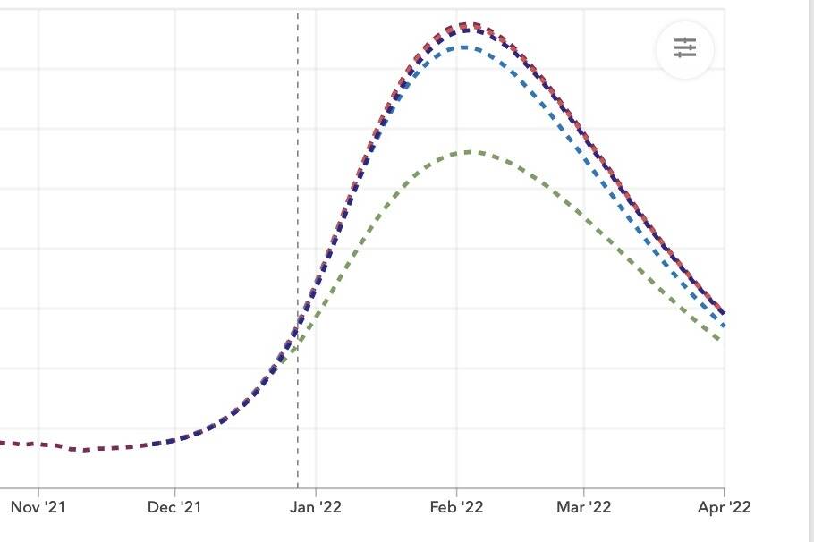 The IHME projects that by Feb. 3, 2022, daily infections will reach 38,000 in Washington alone. Under the best-case scenario, if 80% of the population wore masks as recommended, the IHME projects Washington will still reach 27,000 daily infections by Feb. 3, 2022.