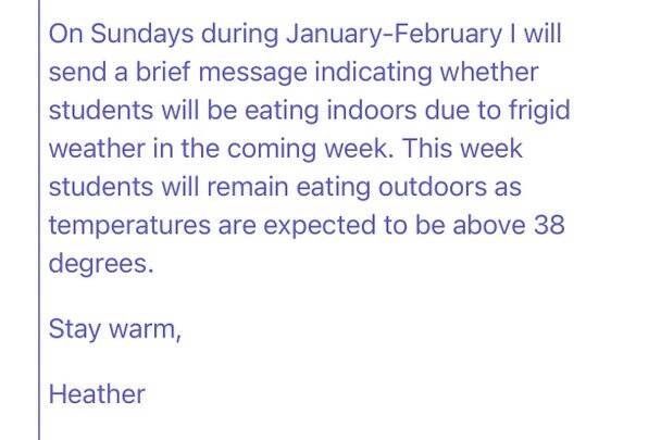 Frazier also said via email that families would be notified the Sunday before school whether they would eat inside or outside based on the weather forecasts for the week, signing the email with “stay warm.”